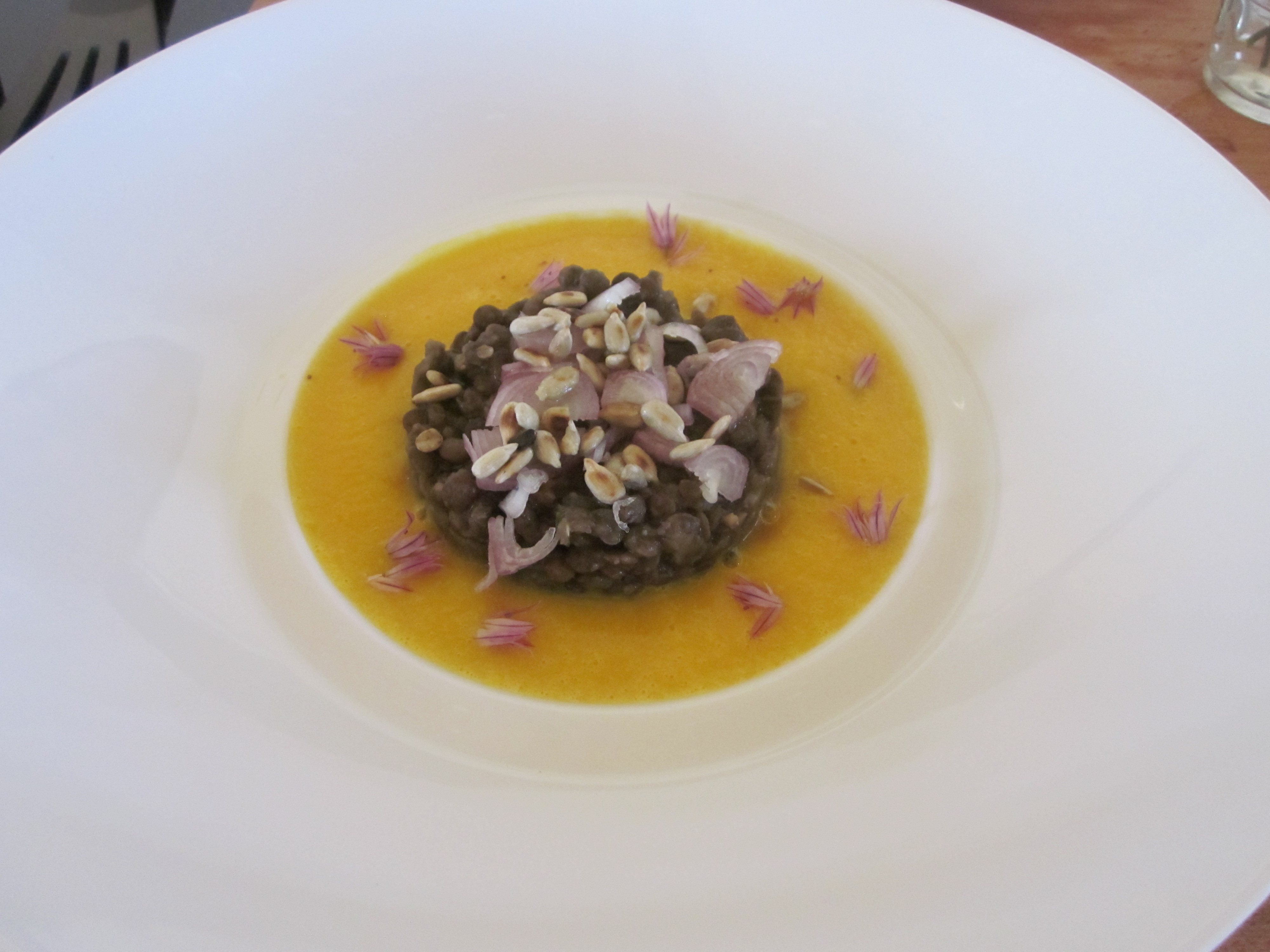 Jean-Pascal Vallee is a former Michelin starred chef who is also a naturopath and now focuses on combining gastronomy with naturopathy. So healthy French cooking! Over 3 ½ hours I learnt the proper techniques for cutting (ciseler, émincer, mirepoir, brunoise, julienne, rondelle etc) and did so much cutting and slicing my fingers went numb. Thankfully I didn’t cut myself, which was something I was very worried about (I didn’t want to embarrass myself in front of the chef!). The dishes we cooked were Veloute de carottes au saffron aux lentilles (Carrot soup/sauce with saffron and lentils) and Fondue de Tomate et courgettes et filet de merlan aux sesames et tournesol (Tomato and zucchini with fish, sesames and leeks).