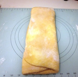 - Roll the dough out into a rectangle about 1cm thick and then fold into thirds. That is, 1st third over the middle third, then final third over.