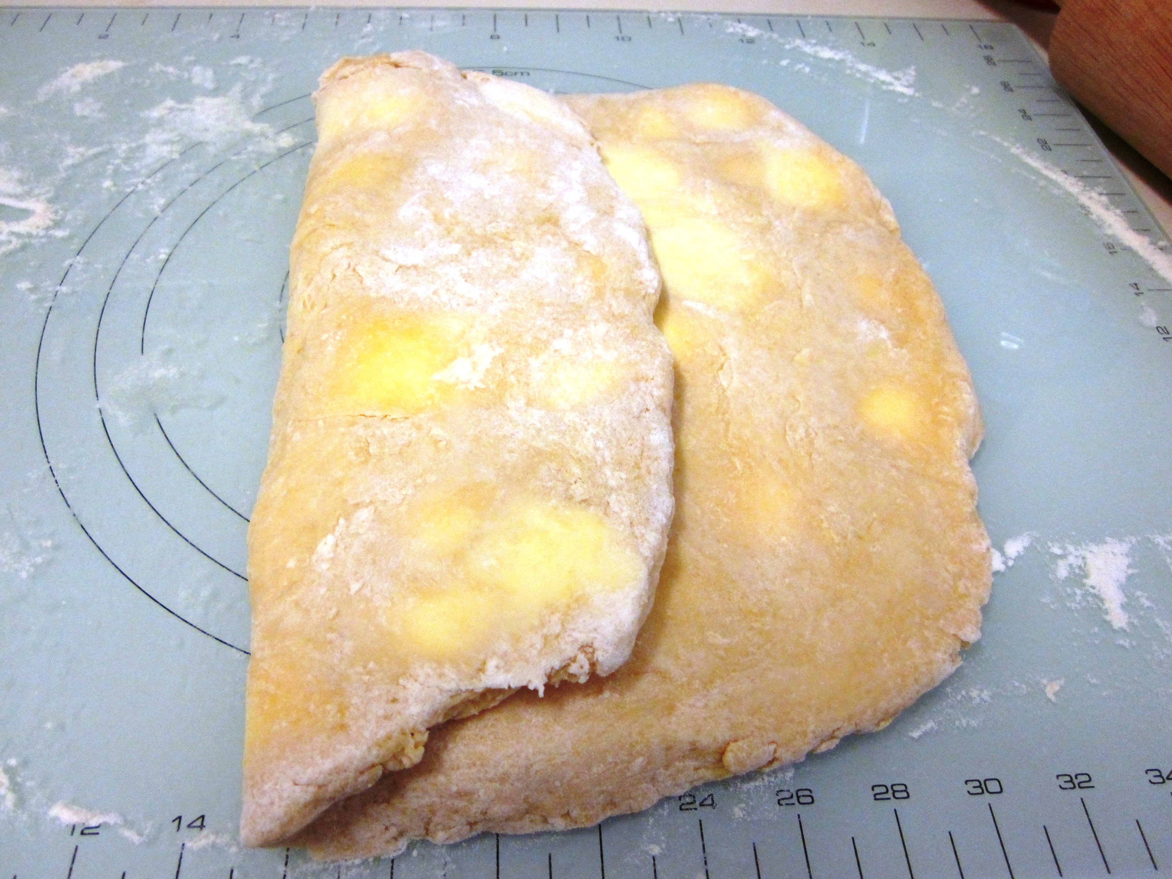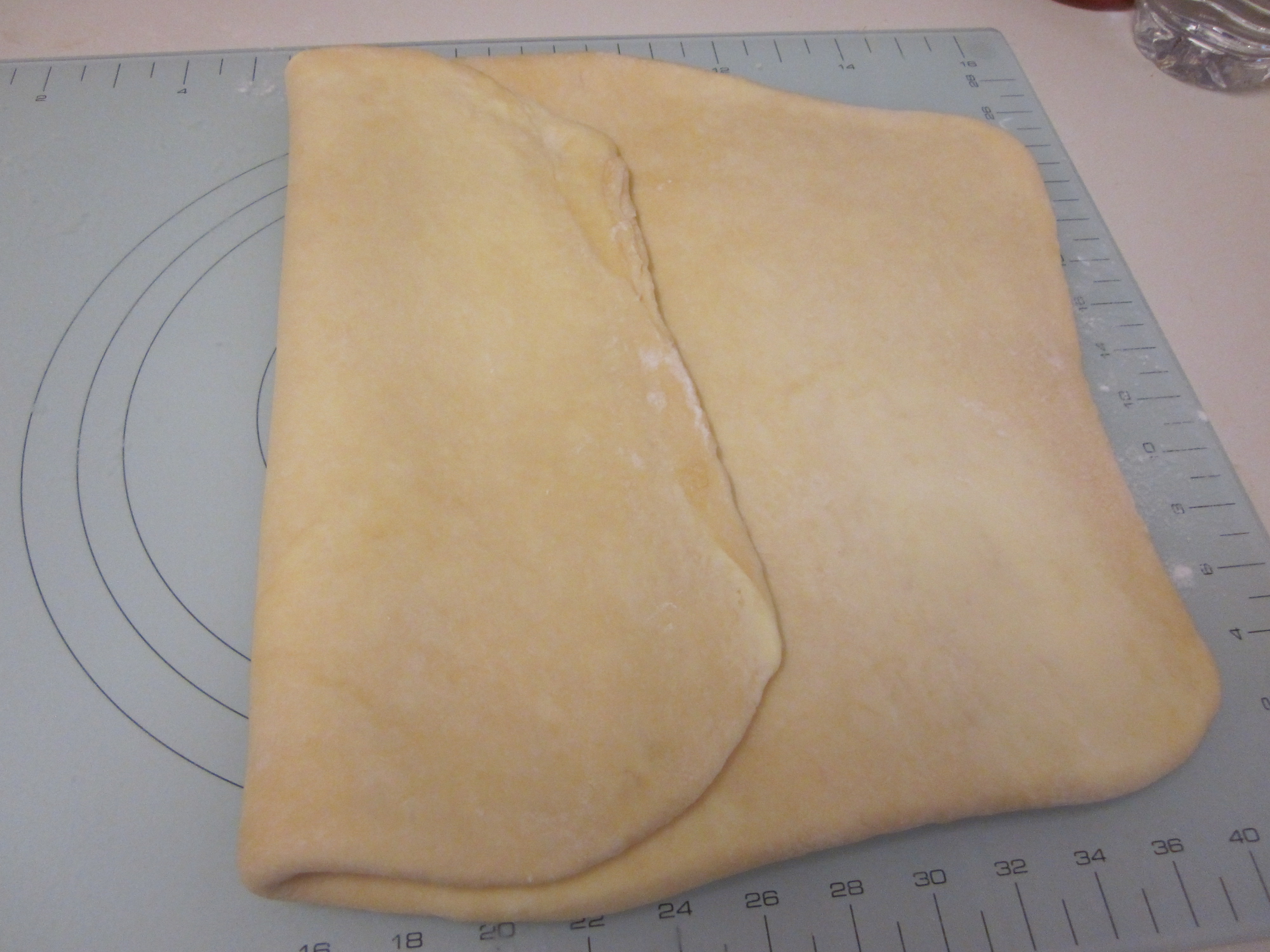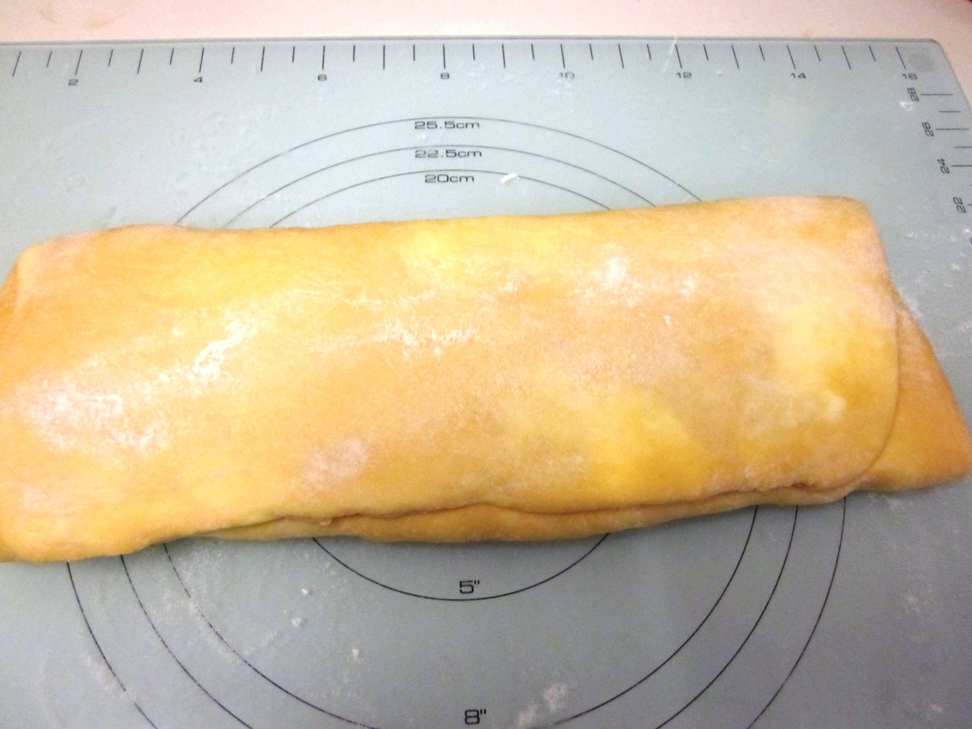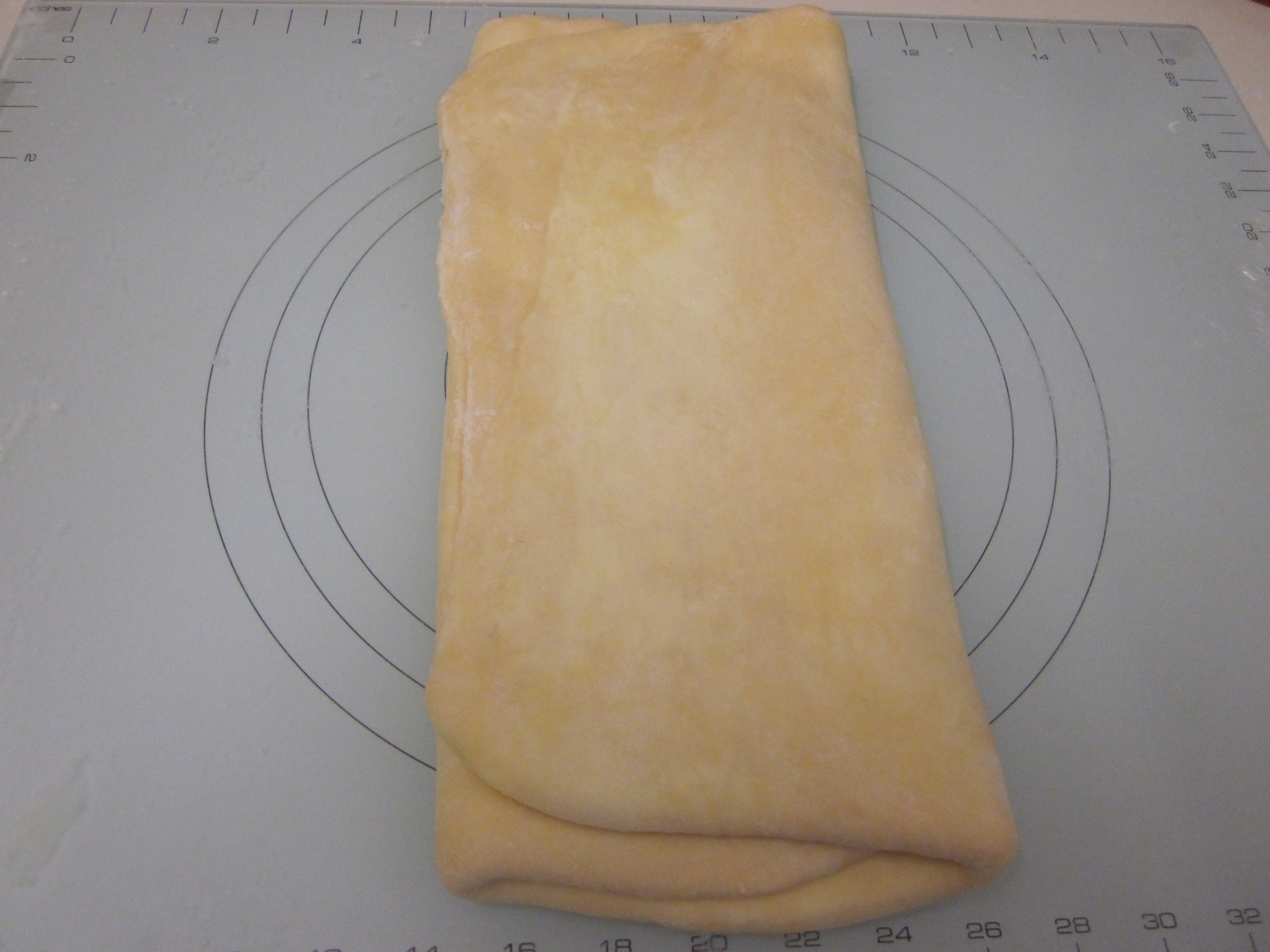 - Roll the dough out into a rectangle about 1cm thick and then fold into thirds. That is, 1st third over the middle third, then final third over.