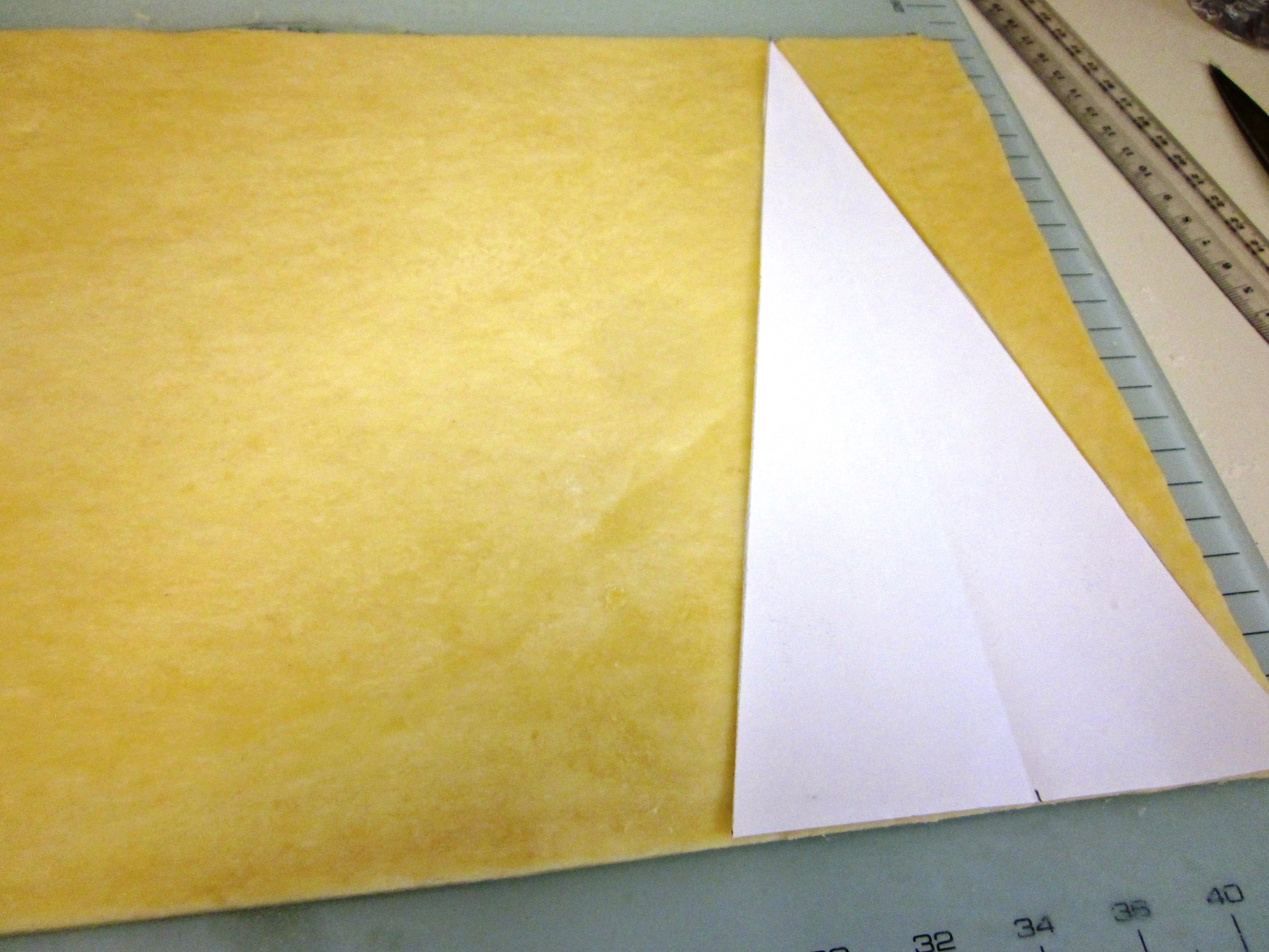 - While the dough is resting, prepare a triangular template to cut out the dough to make the croissants (12cm across the base, 24cm high). After the final rest in the fridge, roll out the dough (on a lightly floured surface) to form a rectangle of 24cm x 50cm, 3mm thick. Trim all the sides to straighten them up and then using the template, cut the dough into long triangles.