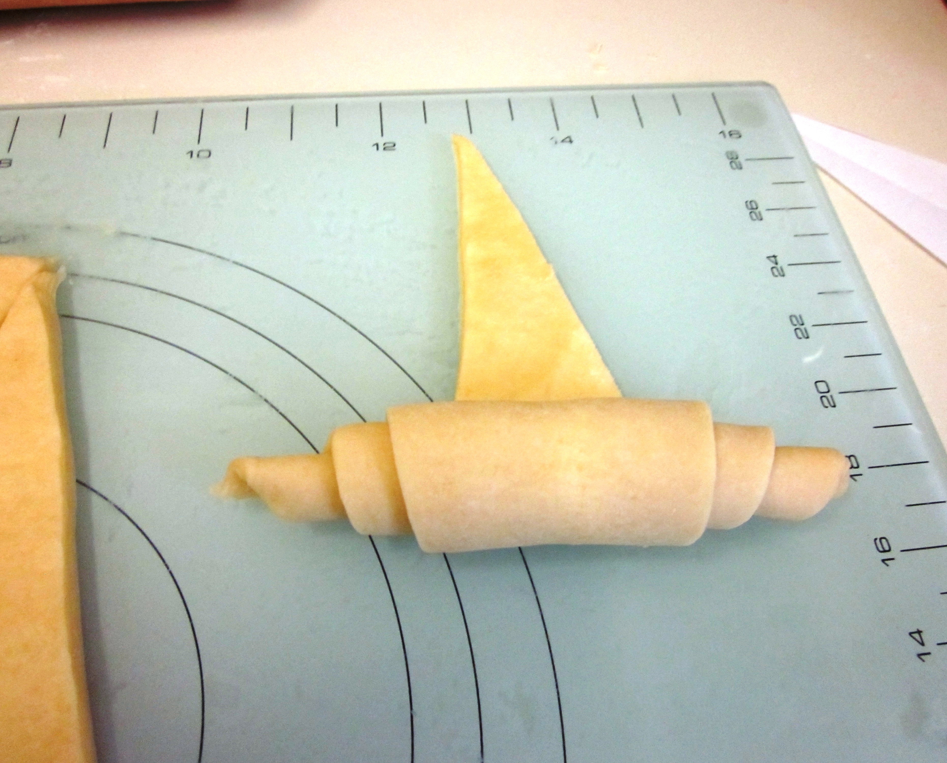 - I used the scraps from cutting to make smaller croissants by trimming them to form smaller triangles as well as a few scrolls, and these turned out really well.