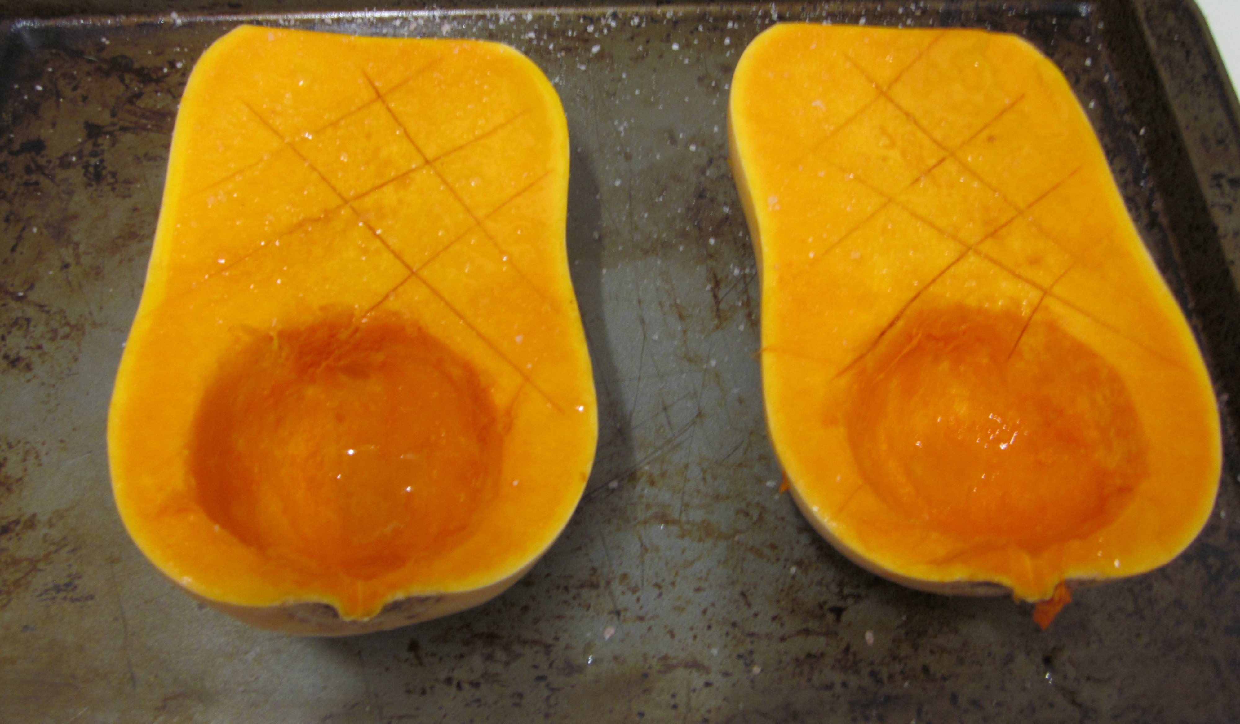 - Cut the butternut pumpkin in half and scoop out the seeds and fibres. Score the surface and drizzle with olive oil to coat and season with salt.