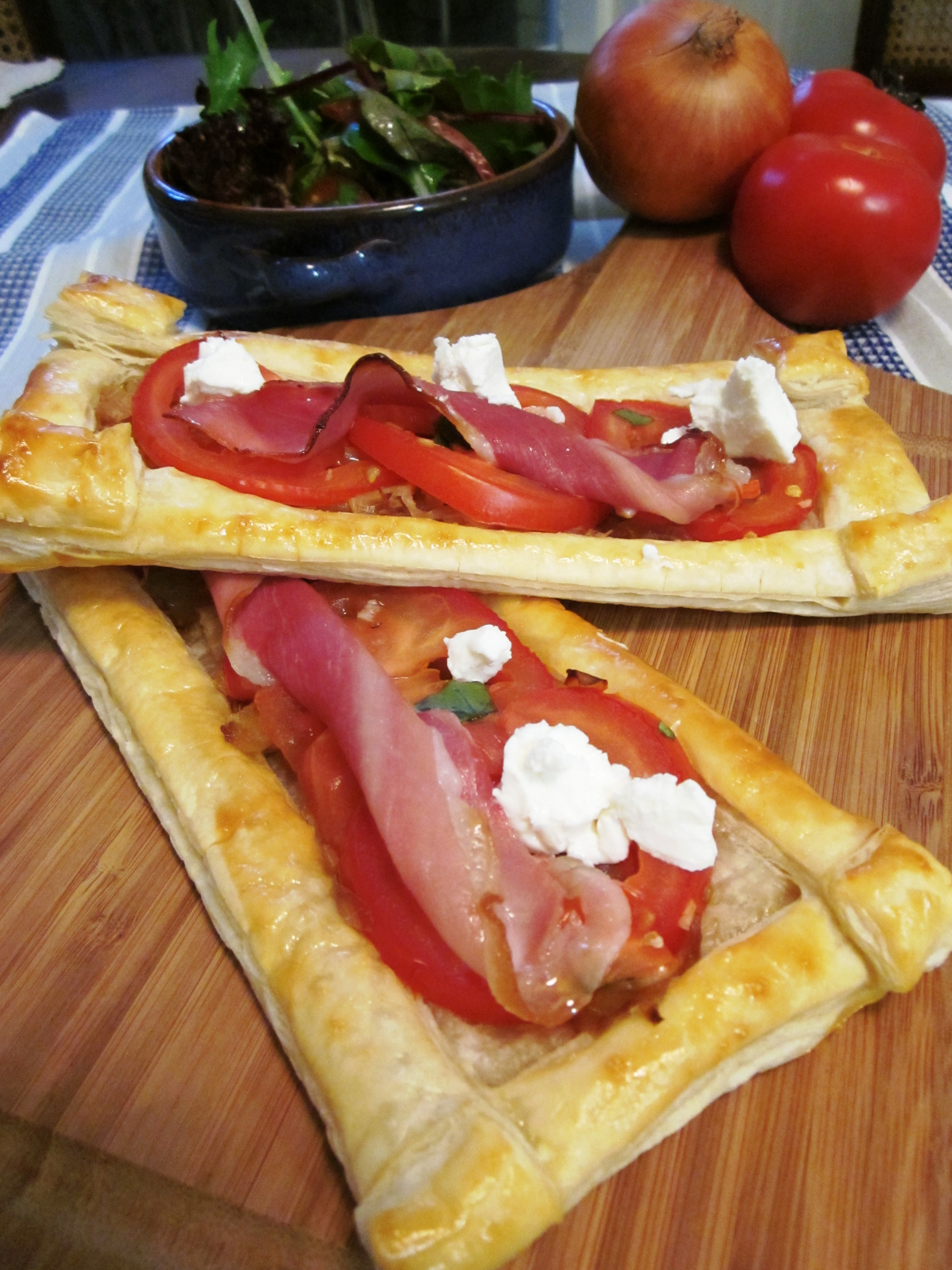 I find I always have extra of the marinated tomatoes mix left whenever I make this. Rather than use less tomatoes, I like to add a couple of tablespoons of balsamic vinegar and extra virgin olive oil to the remaining tomatoes and their juices, and use this as the dressing (with the tomatoes) for the salad greens. I usually get enough for six tarts from 4 large onions (although I used one less onion this time and still made the 6 tarts, so there wasn’t as much onion as usual – hence the gaps in the picture). You could also make these into smaller squares for a nice entrée or canapé.